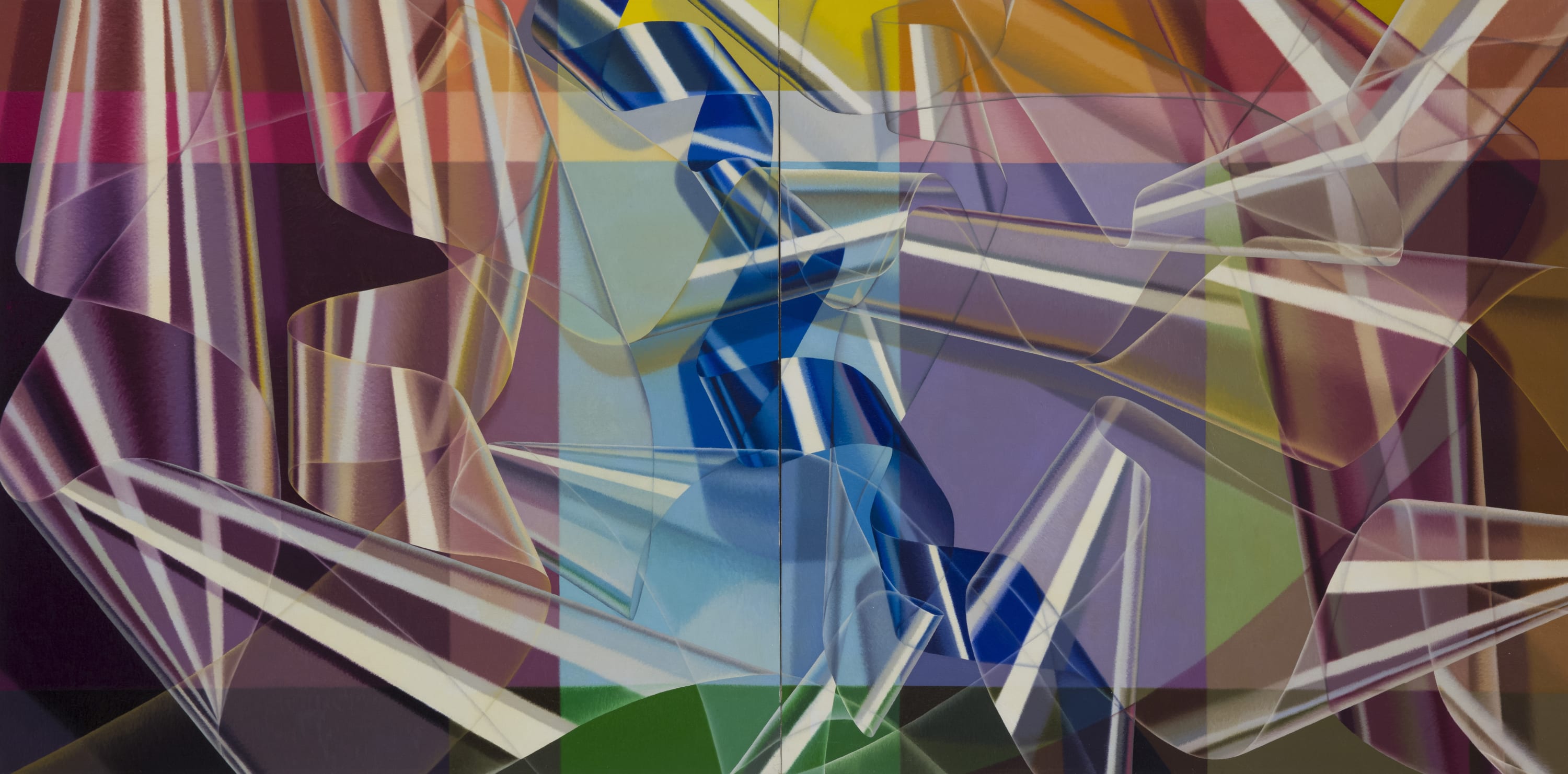 Unlike her color grids of the 1970s that explored the full color spectrum, and are at times reminiscent of textile patterns, in the Twisted Forms, Transparent Band series, 1981-1996, Blocton’s work entered a phase of horizontal expansion. Space became the center of the exploration. She remembers “In this series, I aim to create images that would expand the viewer’s perception of space into multiple dimensions”. The works expressed a new level of energy and dynamism. To extend their reach, Blocton started producing multi-panel works – diptychs and triptychs on canvas, and occasionally multi-panel compositions by combining sheets of paper. The three dimensional illusionism in this series is remarkable, turning space in some of these paintings into galactic landscape. It combines sculptural modeling to effects of transparencies and light reflections. To compose these works, Blocton set up still lives in her studio with roles of translucent paper and color grid works set up behind them. The results are drawings and paintings of incredible precision level. These works are made from observation and scrutiny of the object in front of the artist, in the same way Renaissance masters worked and Picasso set up his cubist guitars. Blocton demonstrates impeccable technique and sense of rhythm in these playful and masterful rendering of reality, which appear completely abstract.